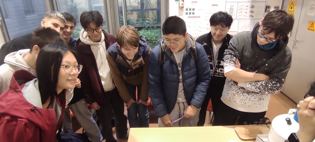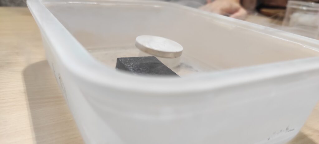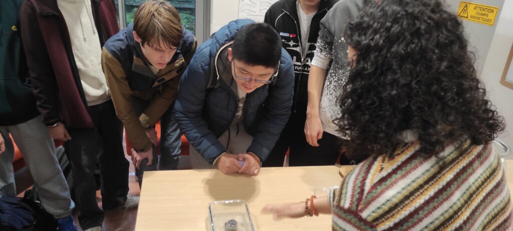 Les supra-conducteurs sont des matériaux qui sont capable de conduire l’électricité à ceci près qu’ils peuvent transmettre l’énergie électrique avec moins de perte qu’un matériau normal. La seule contrainte est qu’ils doivent se trouver à très basse température. Avec peu d’excitation, les noyau « parasites » des impuretés du matériaux interceptent beaucoup moins les électrons. On a donc plongé notre matériau supraconducteur dans le l’azote liquide à -196 °C soit 77 Kelvin. Nous avons ensuite placé un aimant (plus léger que le supraconducteur) dessus et nous avons pu observer qu’il lévitait comme par magie au-dessus du matériau supraconducteur refroidi grâce au champ magnétique engendré par la circulation électronique. On appelle ce phénomène la sustentation magnétique. C’était super beau, ce qui prouve que la physique, c’est beau. On peut aussi dire impressionnant comme expérience, proche de la physique quantique que j’affectionne tout particulièrement. Nous avons ensuite réfléchi à des applications concrètes pour ce phénomène physique. J’ai pensé au train à sustentation magnétique appelé Maglev en phase prototypique au Japon.